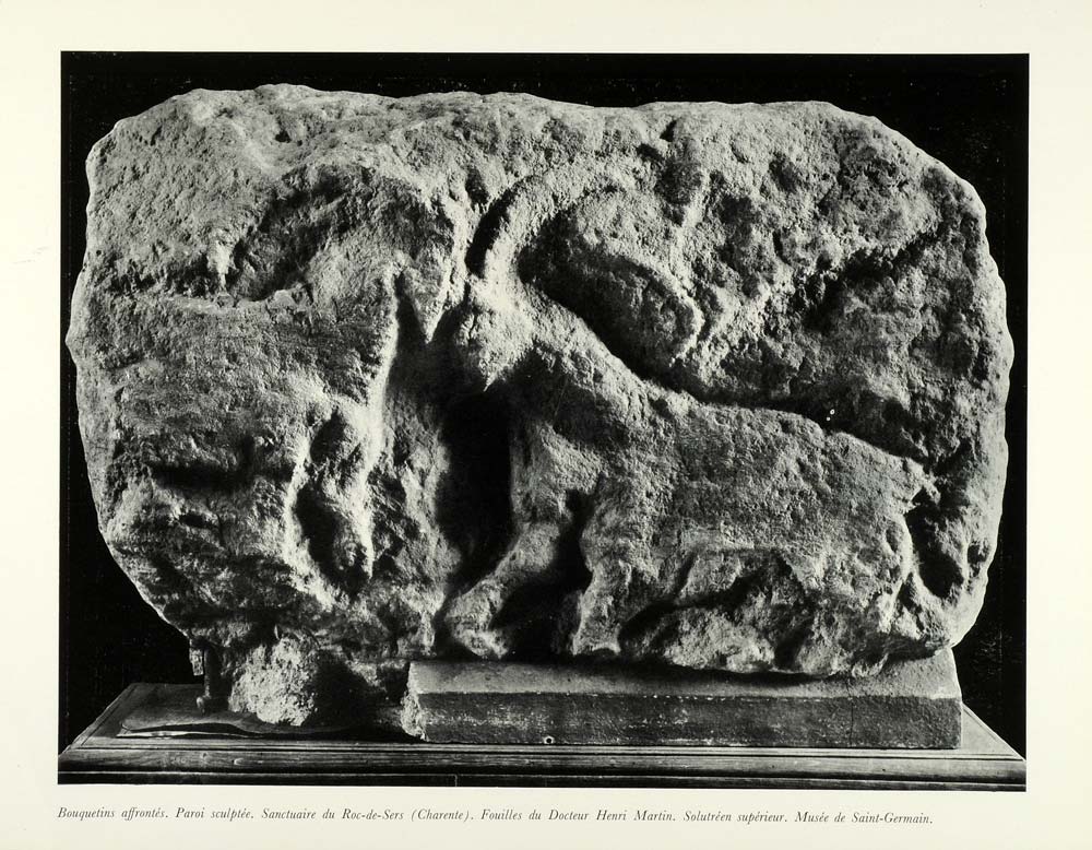 This is an original 1953 halftone print (with French caption) of a prehistoric ibex carving found by excavator Henri Martin. The original sculpture is currently held in the Musée d'Archéologie Nationale (Museum of National Archaeology) at the Château de Saint-Germain-en-Laye close to Paris, France (Republique Française).