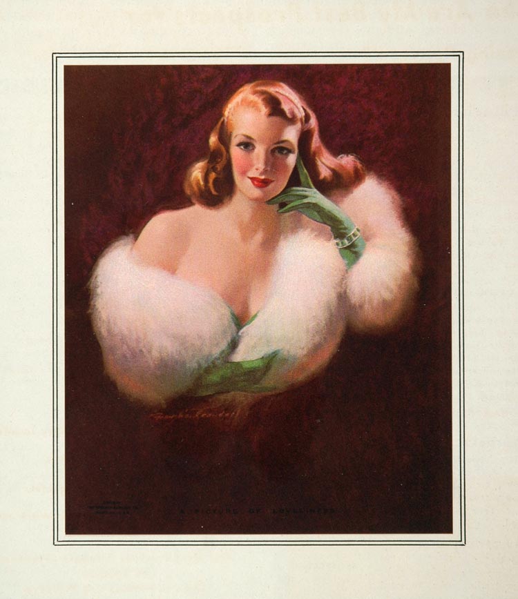 This is an original hand tipped-in print of an elegant blond woman wrapped in a white fur stole and wearing long green opera gloves. The print can be easily removed for framing.
