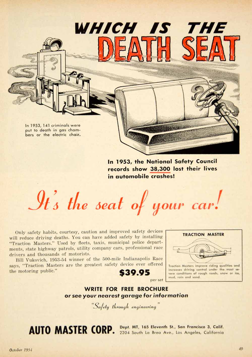 This is an original 1954 two-color print ad for "traction masters" car parts that were made and sold by the Auto Master Corporation of 165 Eleventh Street, San Francisco, California (CA).