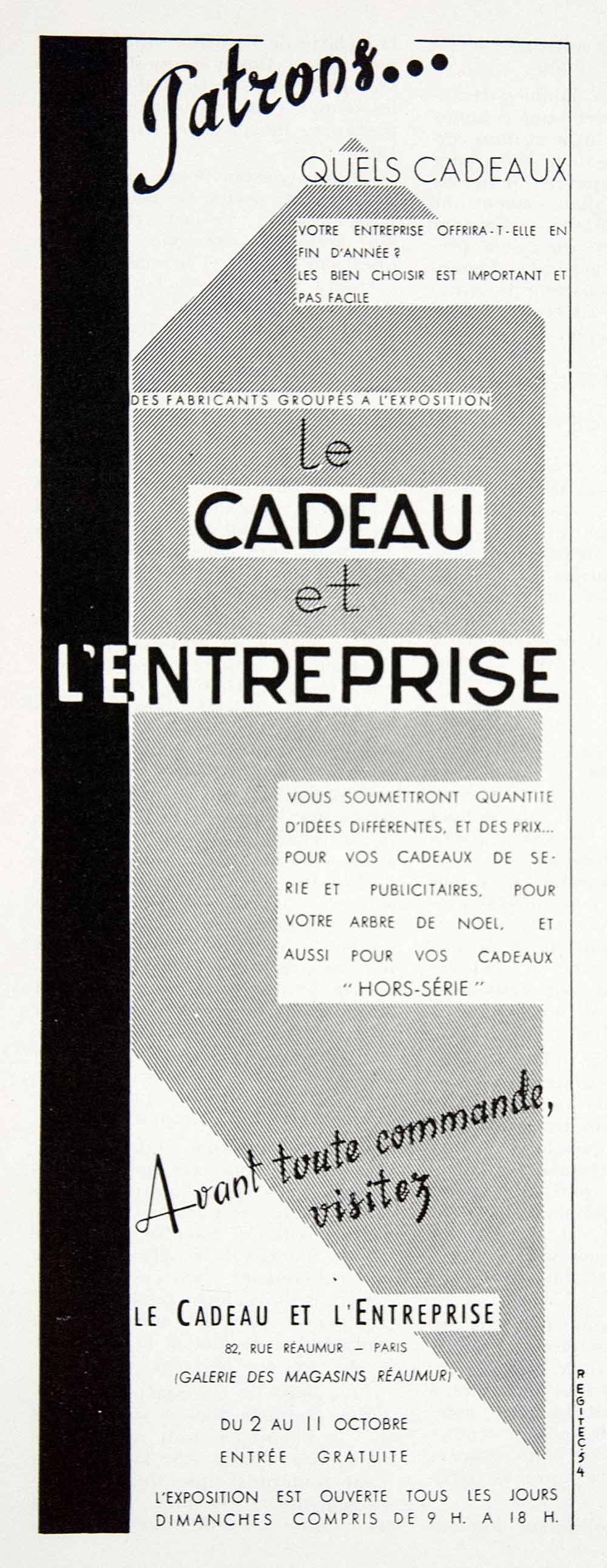 This is an original 1954 black and white print ad for Le Cadeau et L'Entreprise, a French business that specialized in gift-giving for the corporate world.