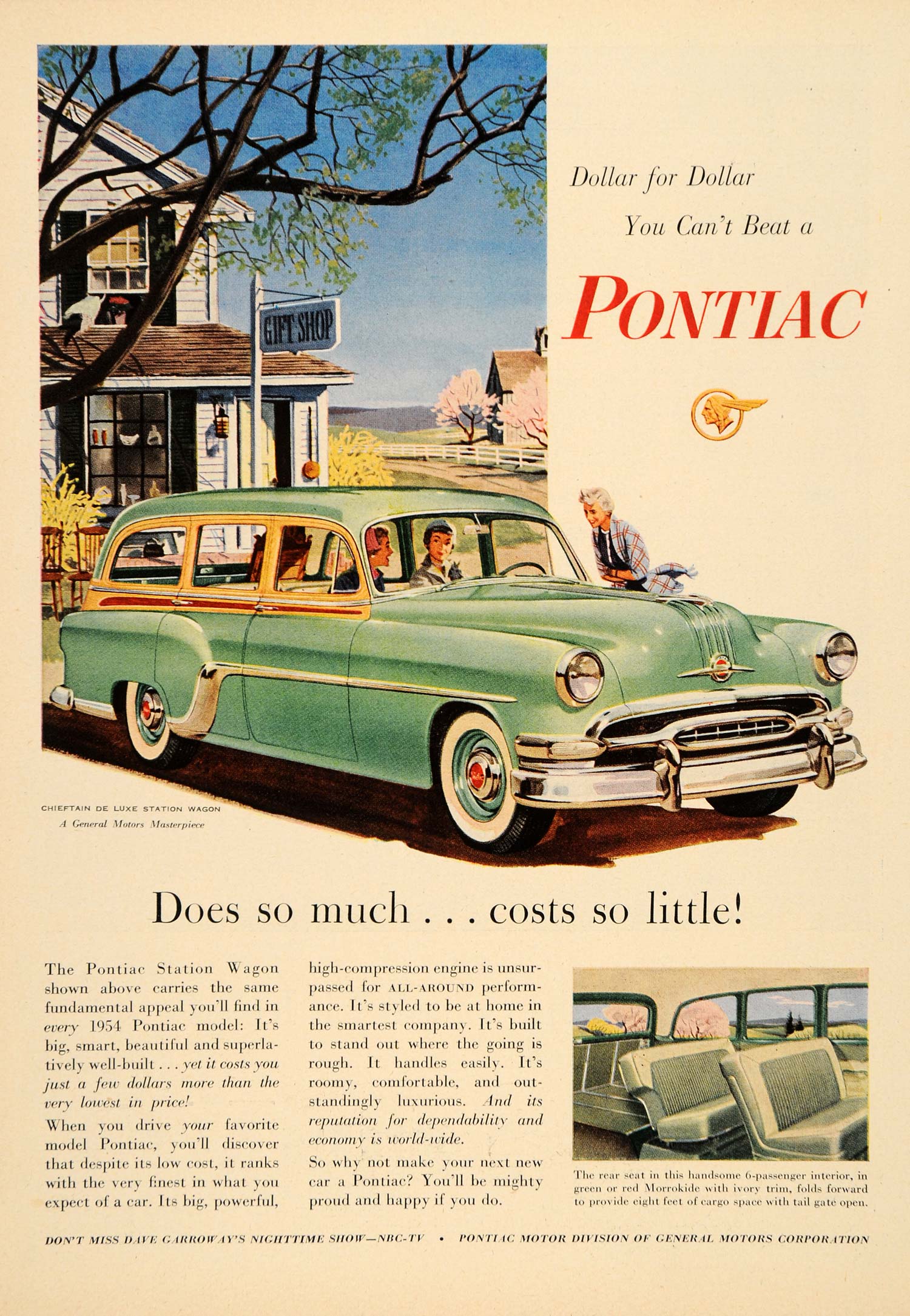 This is an original 1954 color print ad for the Pontiac Chieftain De Luxe Station Wagon. Especially beautiful about this ad is the endearing illustration of what appears to be two women on a road trip, who have stopped off at a friendly local gift shop.