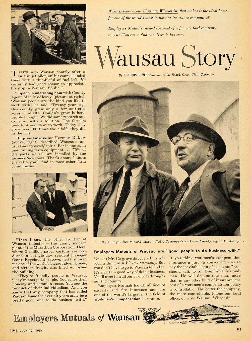 This is an original 1954 black and white print ad for Employers Mutuals of Wausau. This particular ad features E. B. Cosgrove, Mac McAleavy and Oscar Eggebrecht.