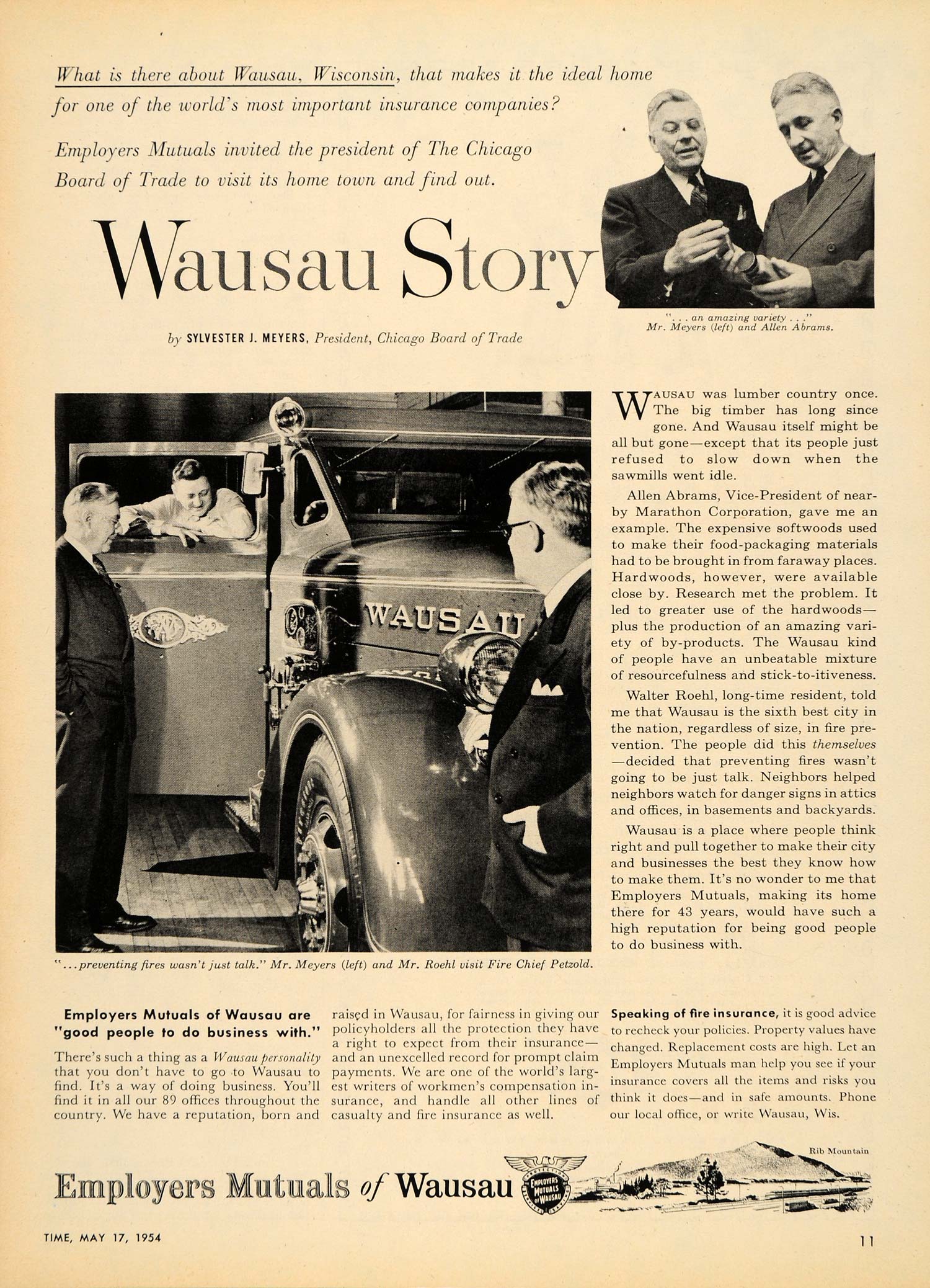 This is an original 1954 black and white print ad for the Employers Mutuals of Wausau Insurance Company located in Wausau, Wisconsin. This ad is part of the series of Wausau Story.