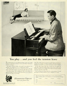 This is an original 1954 black and white print ad for the Hammond Organ from Hammond Organ Company located at 4202 West Diversey Avenue, Chicago, Illinois.