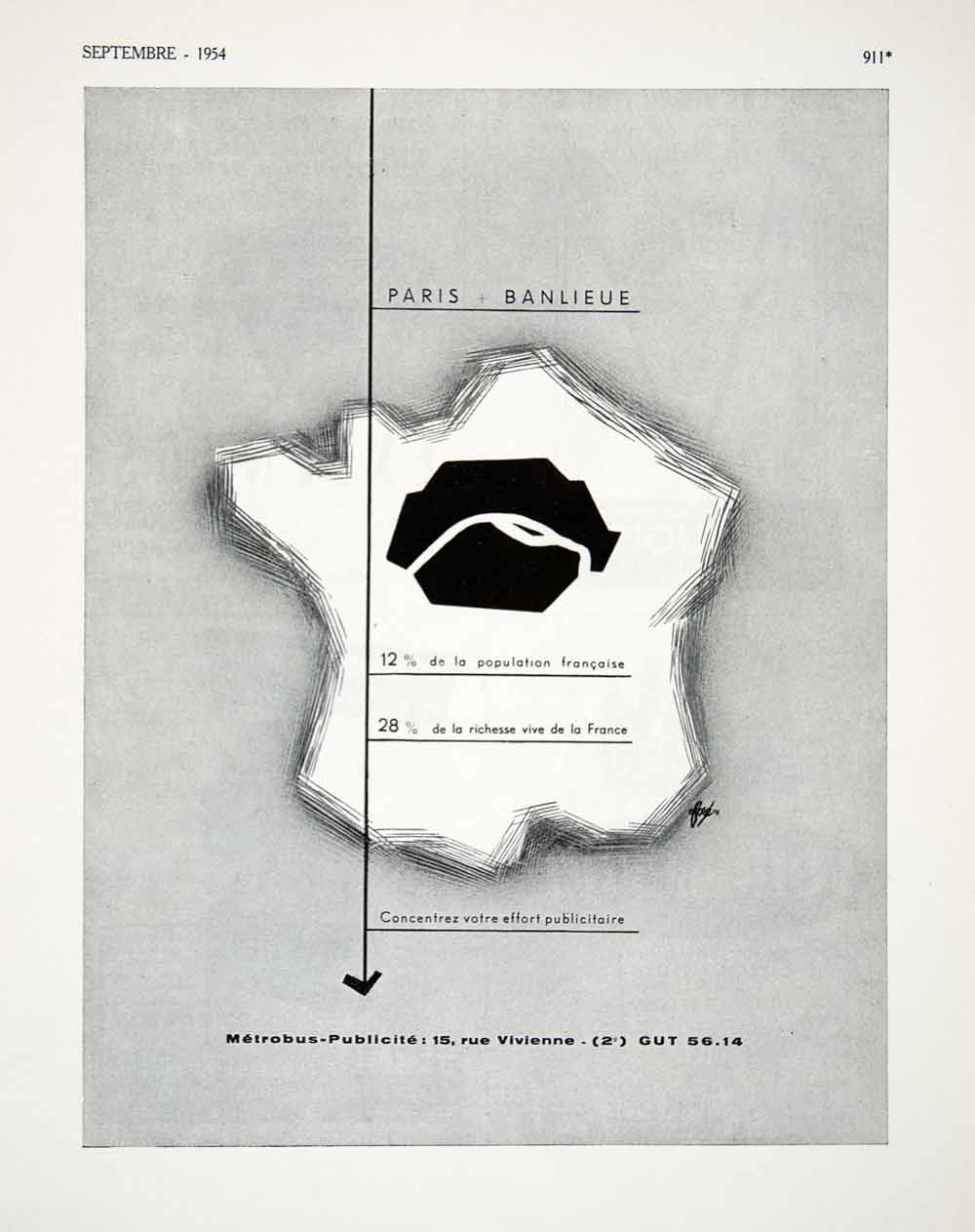 This is an original 1954 black and white print ad for Métrobus-Publicité, a French advertising agency located at 15 rue Vivienne, Paris.
