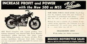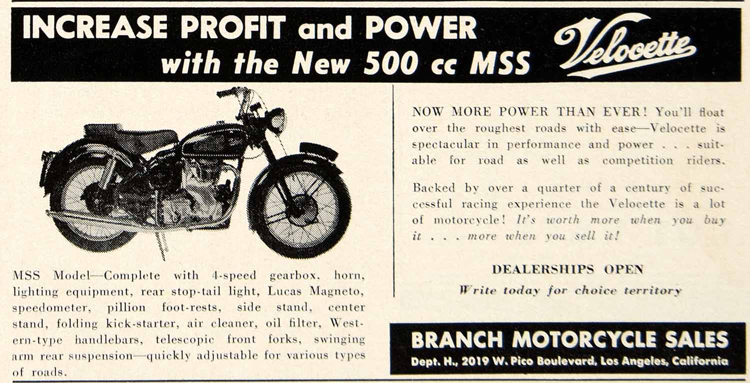 This is an original 1954 black and white print ad for the Velocette, sold by Branch Motorcycle Sales at 2019 West Pico Boulevard, Los Angeles, California.