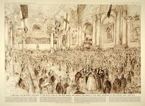 This is an original 1954 duotone print, drawn by Charles William Grineau known as Bryan de Grineau (1883-1957) of the highlight of the Royal tour of the West Riding of Yorkshire -- her Majesty, Queen Elizabeth II and the Duke of Edinburgh at the great reception in the Cutler's Hall in Sheffield.