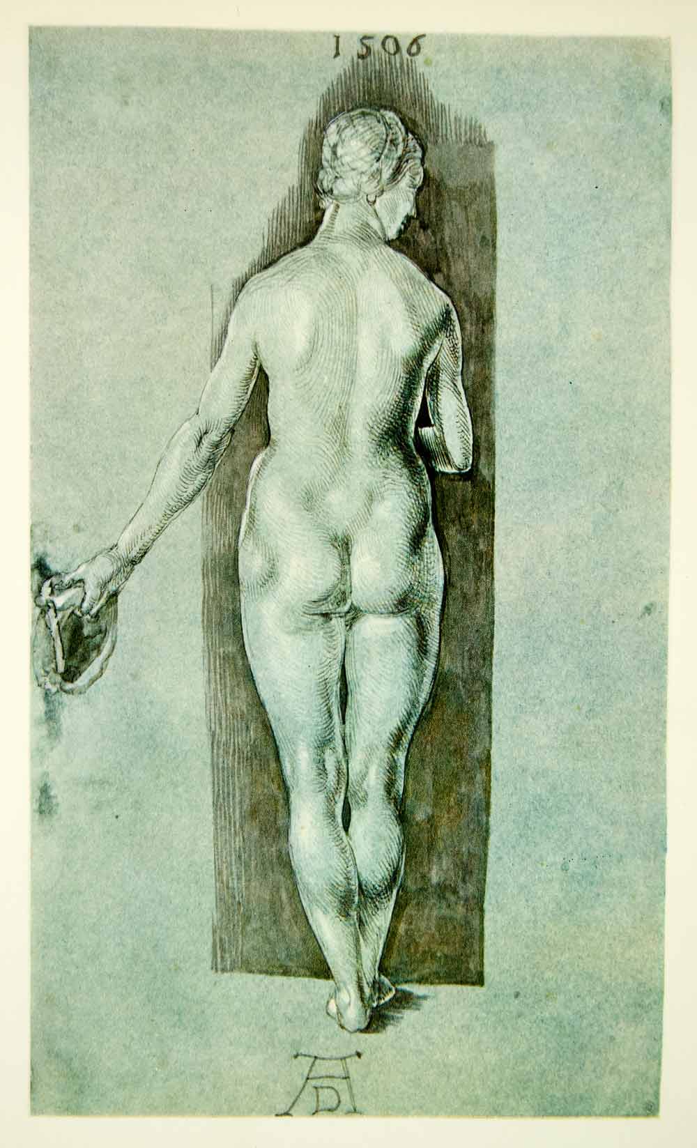 This is an original 1954 color rotogravure of an original brush drawing in India ink, "Nude Woman seen from the Back."