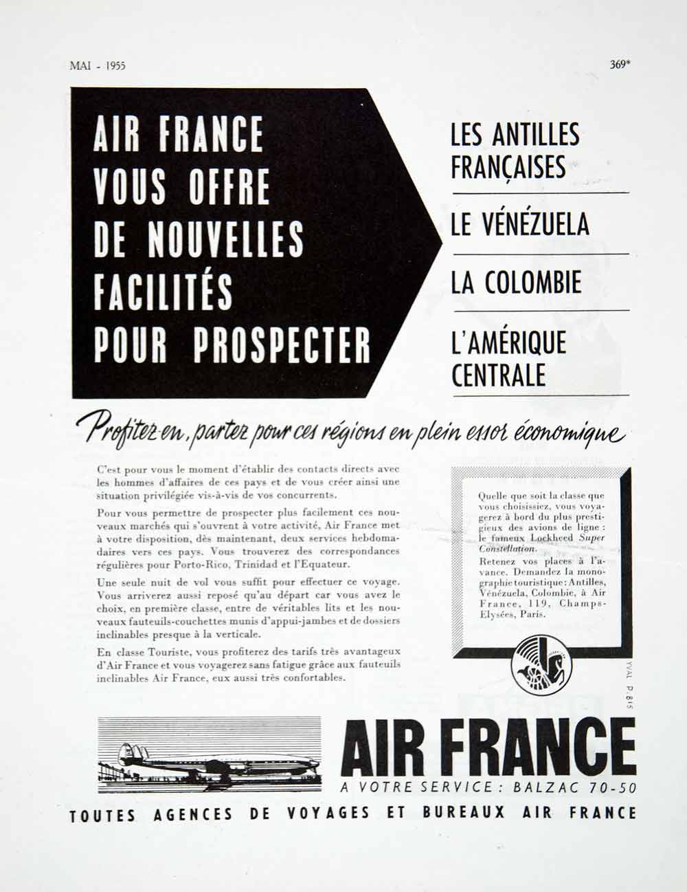 This is an original 1955 black and white print ad for flights from Air France. The advertisement showcases the flights to the French Antilles, Venezuela, Colombia, and Central America.
