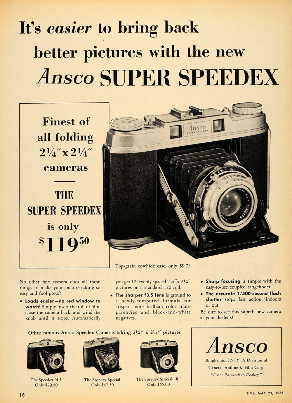 This is an original 1955 black and white print ad for the Ansco Super Speedex camera from Ansco, a Division of General Aniline & Film Corporation located in Binghamton, New York.
