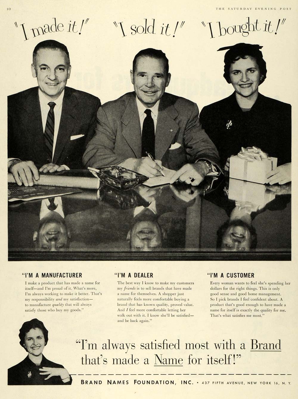 This is an original 1955 black and white print ad for Brand Names Foundation, Inc. located at 437 Fifth Avenue, New York City, New York.
