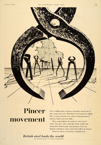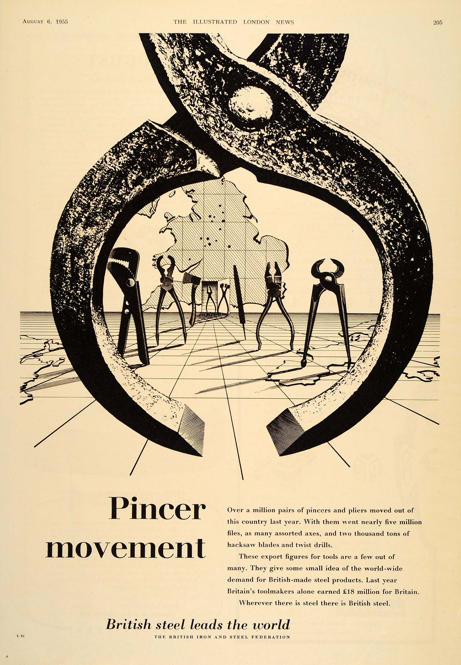 This is an original 1955 black and white print ad for British Steel from the British Iron and Steel Federation, manufacturers of steel for tools.