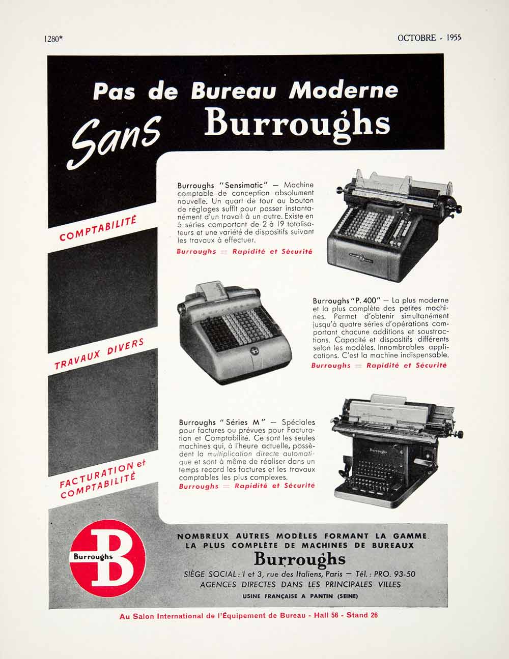 This is an original 1955 two-color print ad for calculators and typewriters from Burroughs.