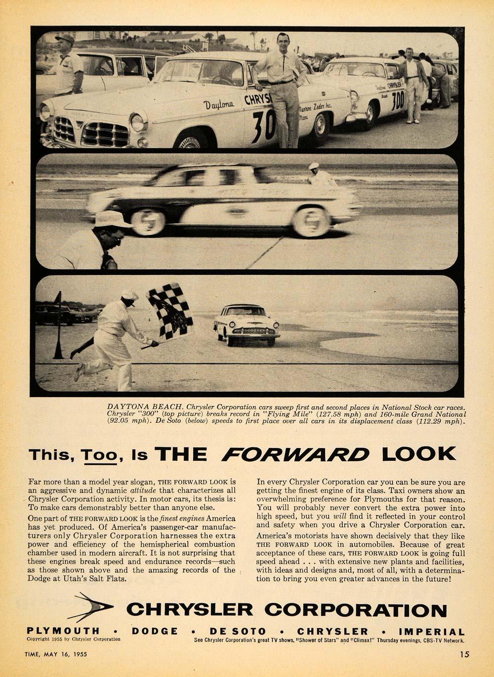 This ad features an image of the Chrysler Corporation Cars during the National Stock car races Chrysler "300" in Daytona Beach, Florida .