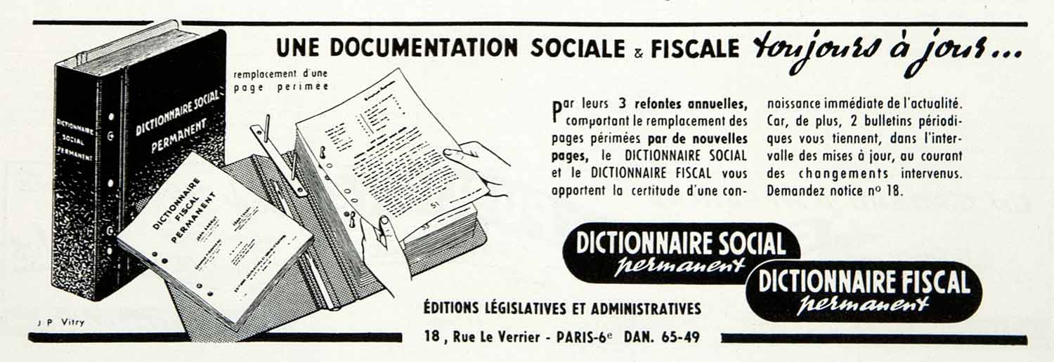 This is an original 1955 black and white print ad for Dictionnaire Social and Dictionnaire Fiscal of 18 rue Le Verrier of Paris, France (Republique Française).