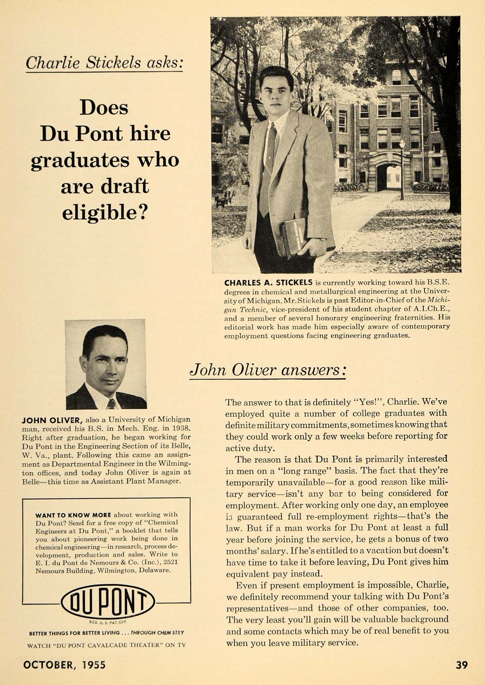 This is an original 1955 black and white print ad for the Du Pont company. The ad features an image of Charles A. Stickels from the University of Michigan and John Oliver of Du Pont.