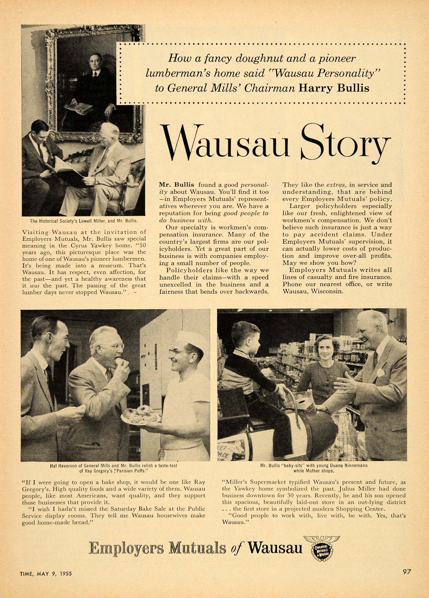 This is an original 1955 black and white print ad for the Employers Mutuals of Wausau Insurance Company located in Wausau, Wisconsin. This ad is part of the series of Wausau Story.