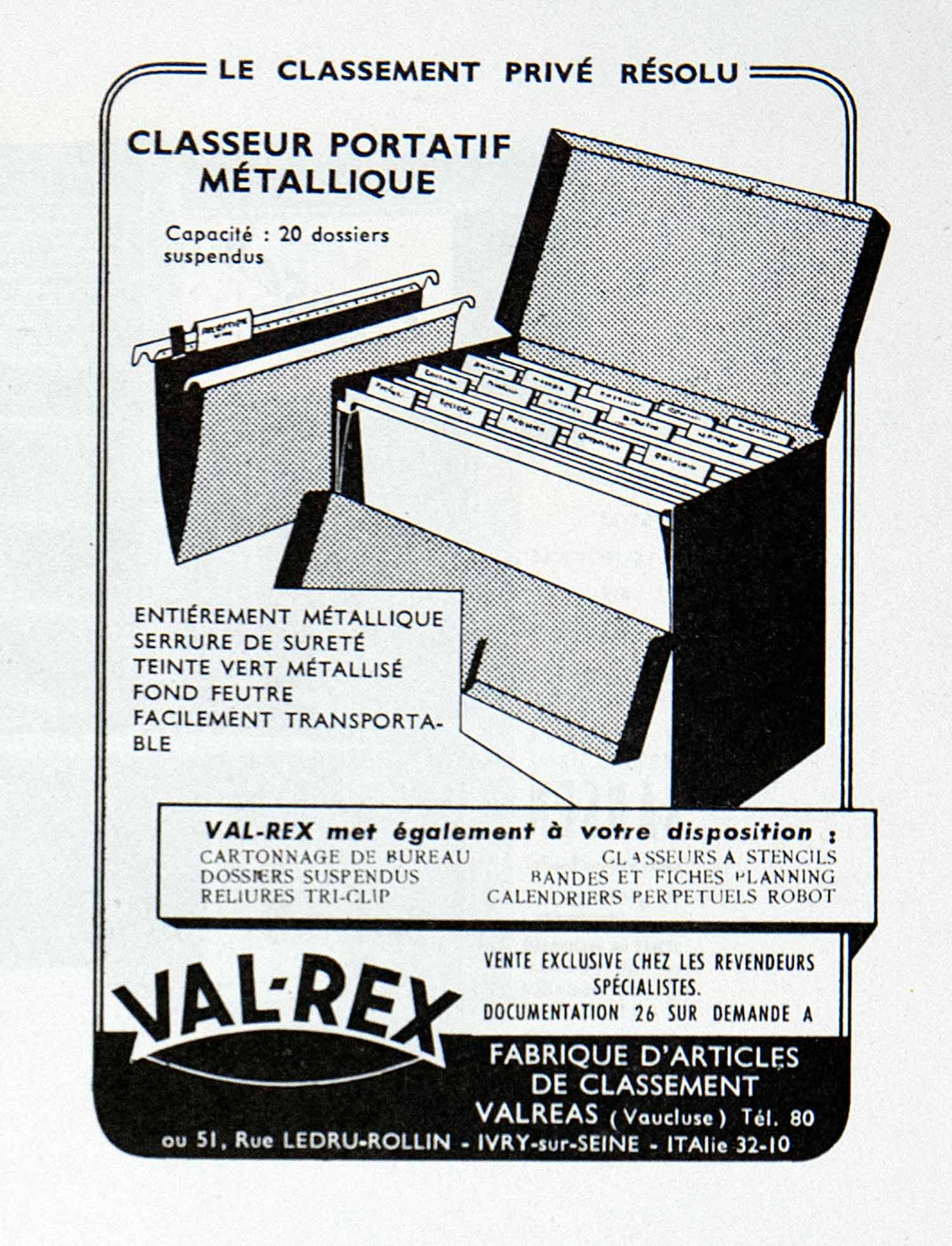 This is an original 1955 black and white print ad for metal filing cabinets from Val-Rex of 51 rue du Boccador, Paris, France (Republique Française).