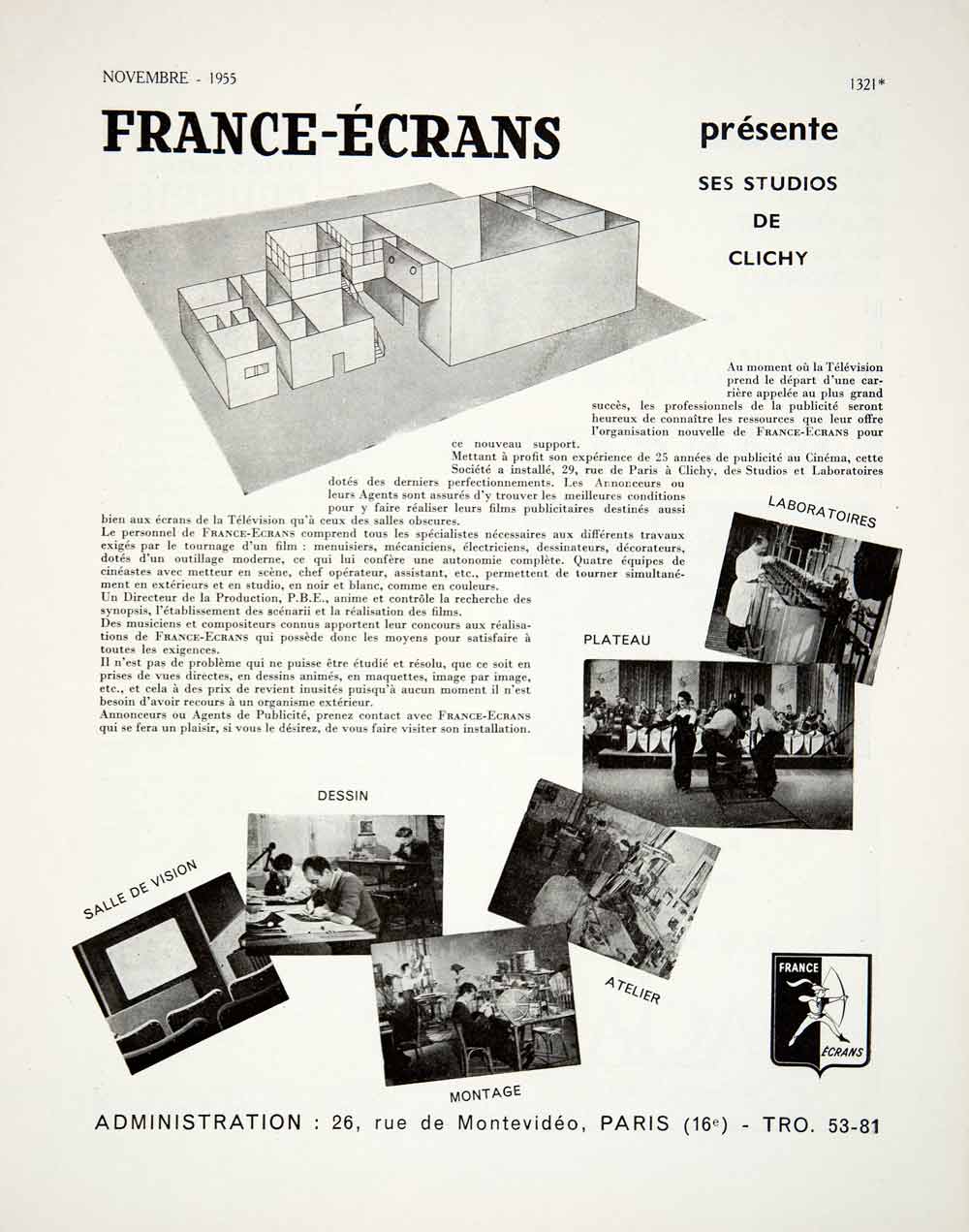 This is an original 1955 black and white print ad for the Clichy studio from France-Écrans from 26 rue de Montevideo of Paris, France (Republique Française).