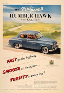 This is an original 1955 color print ad for the Humbler Hawk from the Humbler Company, Ltd., a division of the Rootes Group.