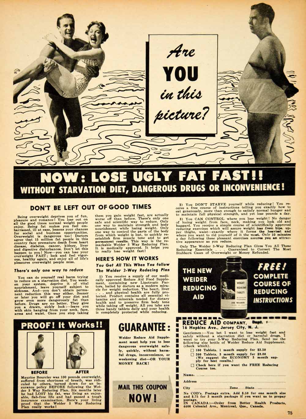 This is an original 1955 black and white print ad for Joe Weider's Weight Reducing Tablets.