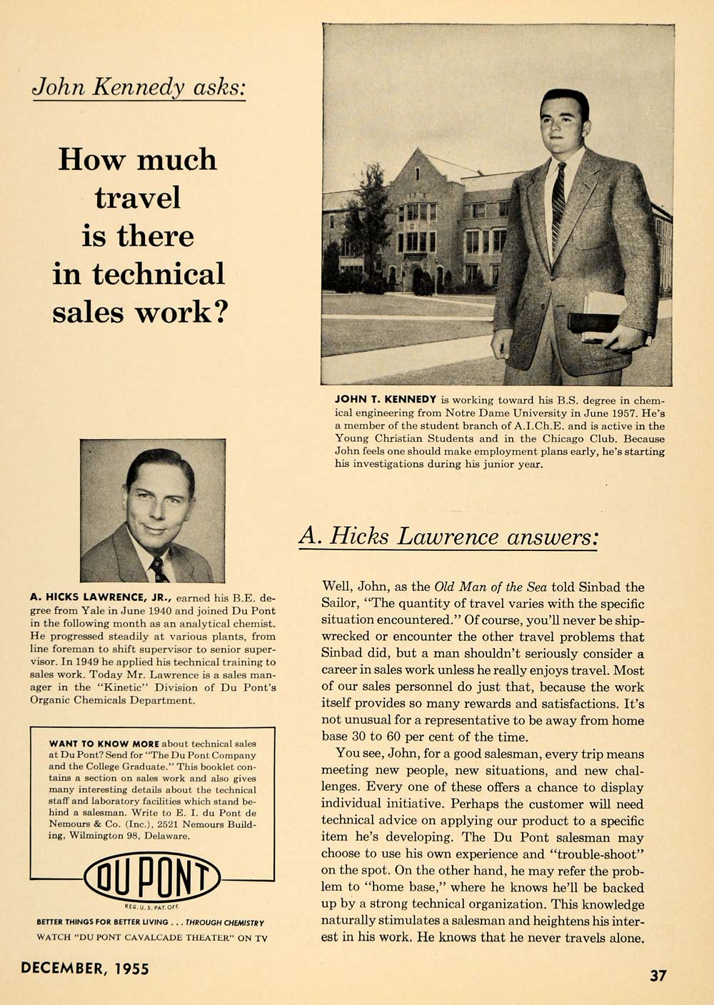 This is an original 1955 black and white print ad for the Du Pont Chemical Company. The ad features an image of John T. Kennedy and A. Hicks Lawrence, Jr.