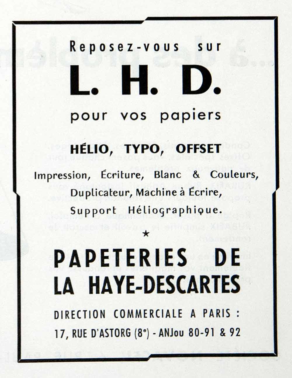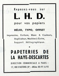 This is an original 1955 black and white print ad for La Haye-Descartes, the manufacturers of hélio, typo, and offset paper stocks for printing (located at 17, Rue d'Astrog in Paris, France).