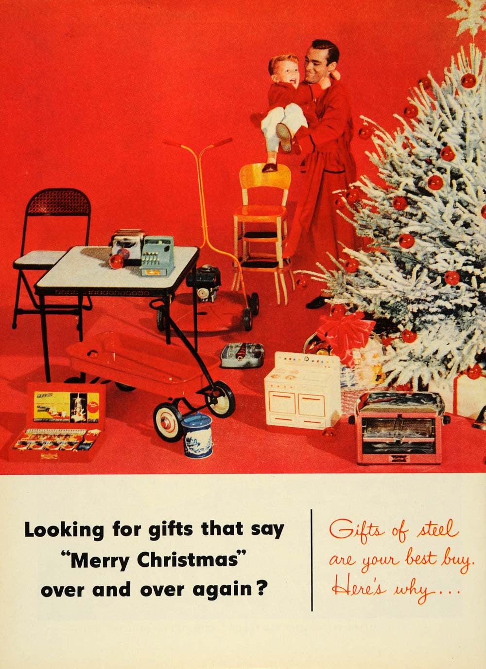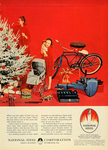 This is an original 1955 color two-page print ad for the National Steel Corporation of Pittsburgh, Pennsylvania. The ad features an image of a family after opening presents on Christmas morning.