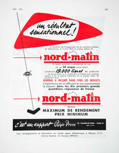 This is an original 1955 two-color print ad for the Nord-Matin newspaper from Régie-Presse of 75 Champs-Elysées, Paris, France (Republique Française). The director of advertising at the time of this image was M. Georges Grétaux.