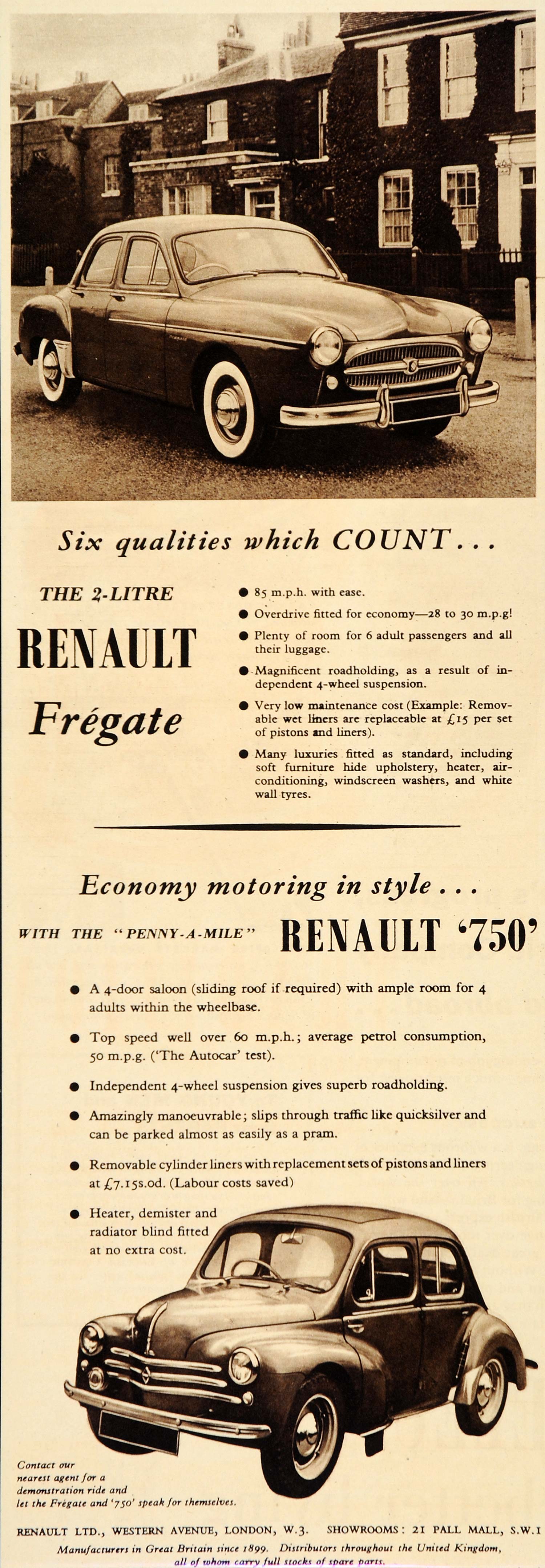 This is an original 1955 print ad for the Renault 2-litre FrŽgate, and the Renault 750 4-door saloon available from Renault Ltd., London.