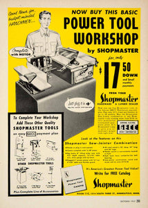 This is an original 1955 two-color print ad for the power tool workshop station that was made and sold by Shopmaster of 1214 South Third Street, Minneapolis, Minnesota (MN).