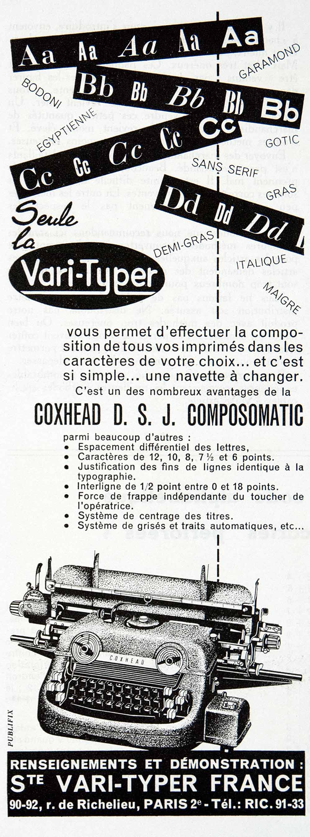 This is an original 1955 black and white print ad for the Coxhead D. S. J. Composomatic typewriter of 90-92 rue de Richelieu, Paris, France (Republique Française).