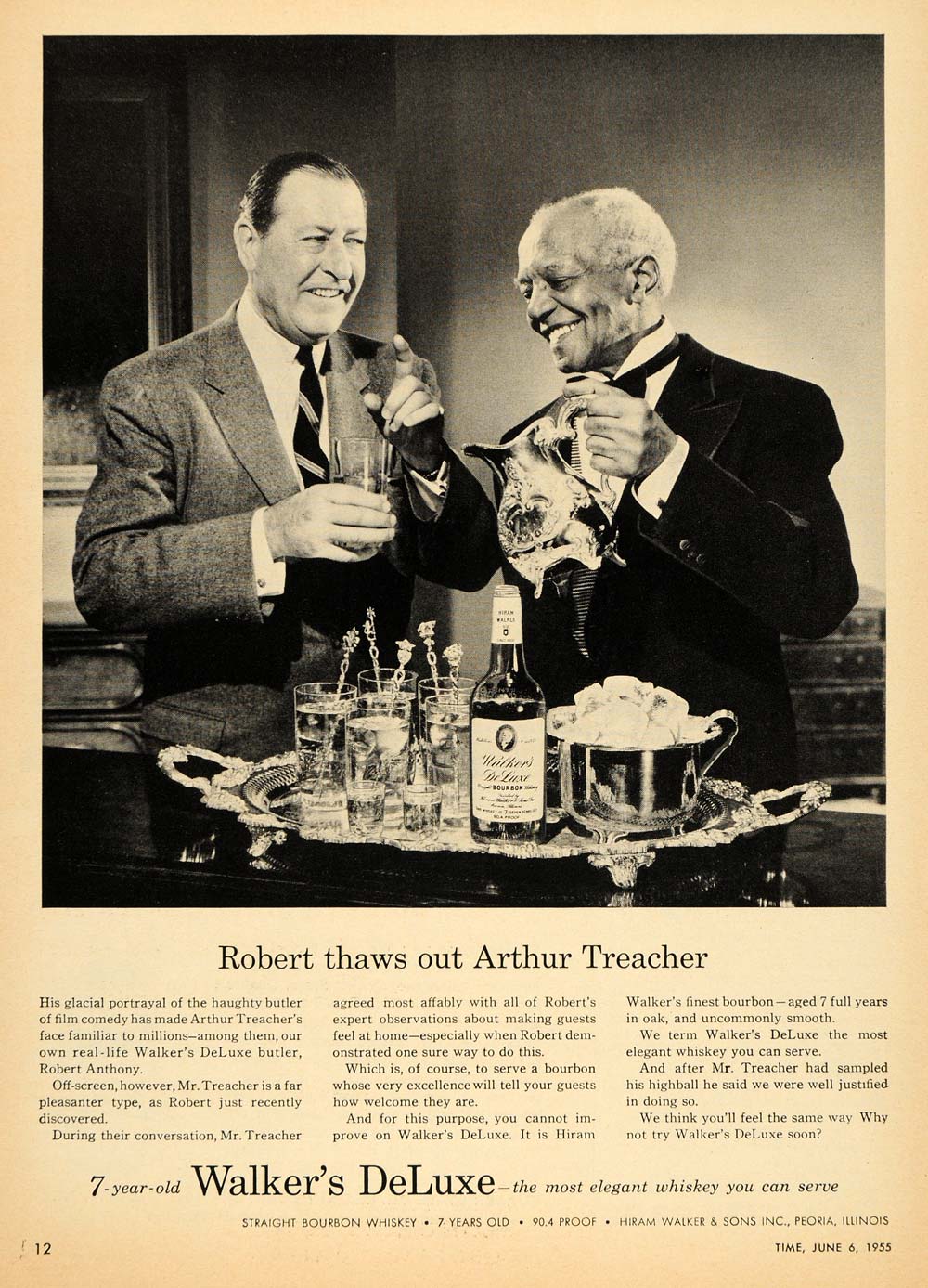 This is an original 1955 black and white print ad for Walker's DeLuxe Straight Bourbon Whiskey; this liquor is a product of Hiram Walker & Sons, Incorporated, of Peoria, Illinois. This ad features the English actor Arthur Treacher and her butler, Robert Anthony, enjoying a drink together.