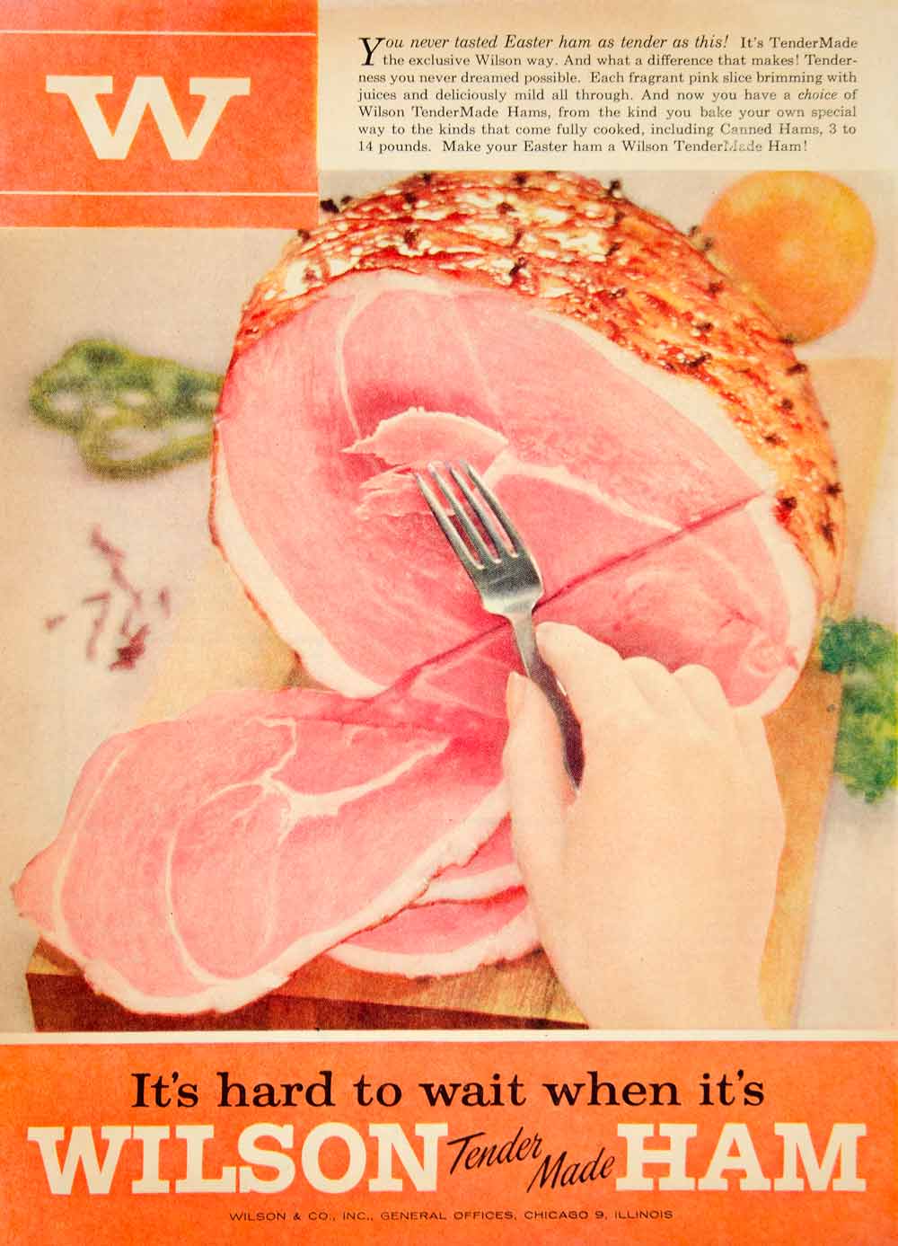 This is an original 1955 color print ad for Tender-Made Easter hams that were made and sold by Wilson & Company, Inc. of Chicago, Illinois (IL).