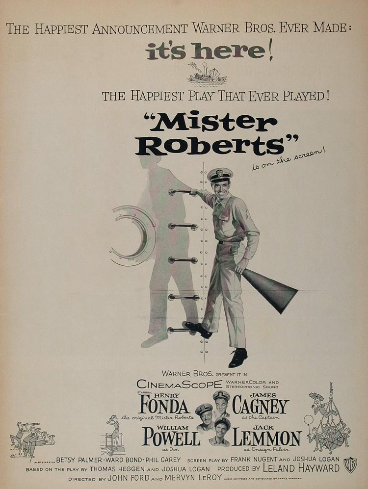 This is a 1955 black and white print ad for the movie "Mister Roberts" starring Henry Fonda, James Cagney, William Powell and Jack Lemmon. Produced by Leland Hayward and directed by John Ford and Mervyn LeRoy. A Warner Brothers Picture.