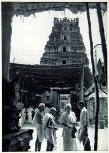 This is an original 1955 duotone rotogravure of a Brahmin buying pencils in the street in front of a temple at Srirangam, Tiruchirapalli, India. A Brahmin is a member of one of the four varnas (castes) in the the traditional Hindu societies of India and Nepal.