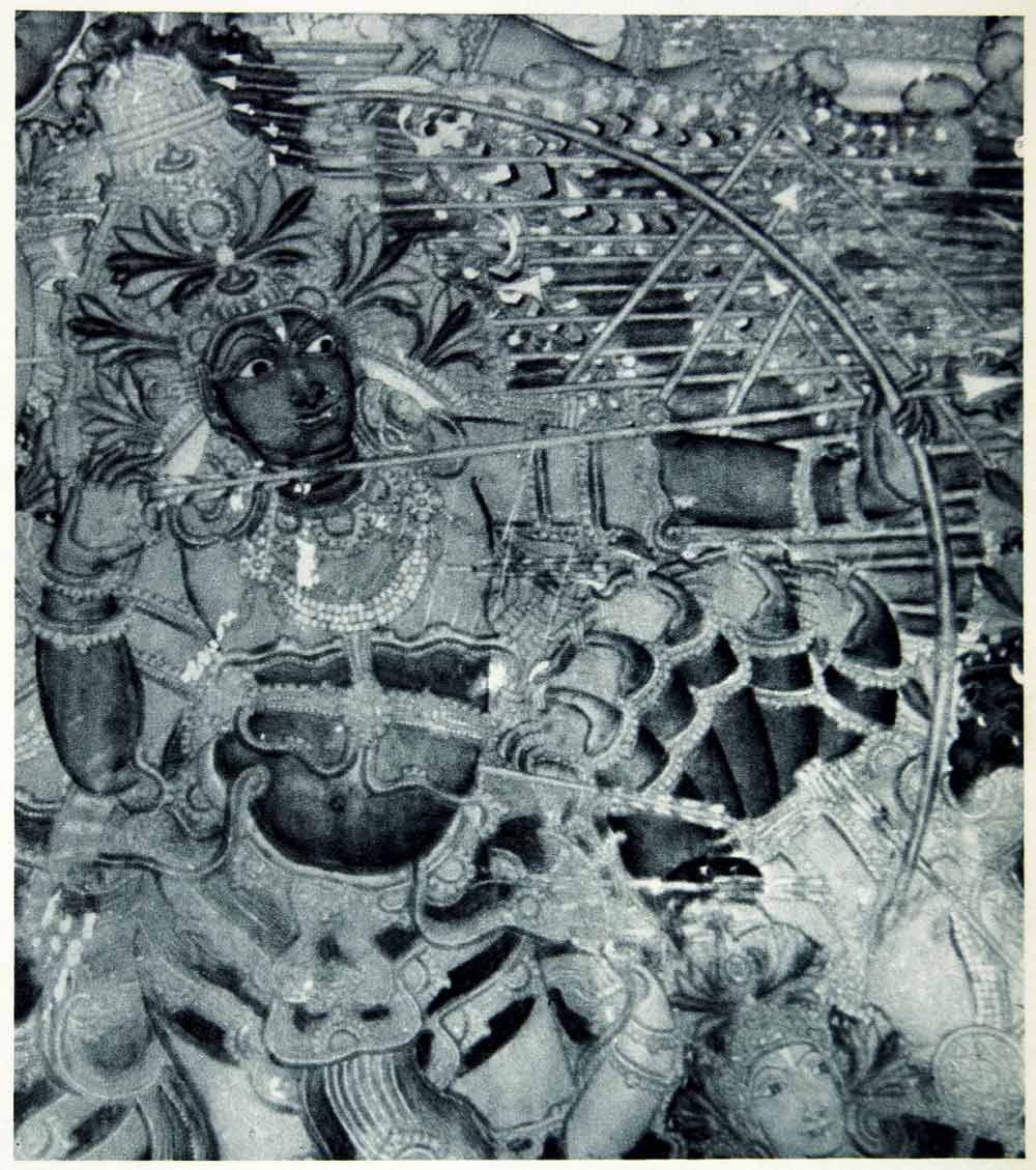 Ramayana where Rama draws his bow to slay the demon Ravana. This detail is from a series of murals in the Mattancheri palace at Kochi (Cochin), India. It dates to about 1600 AD.