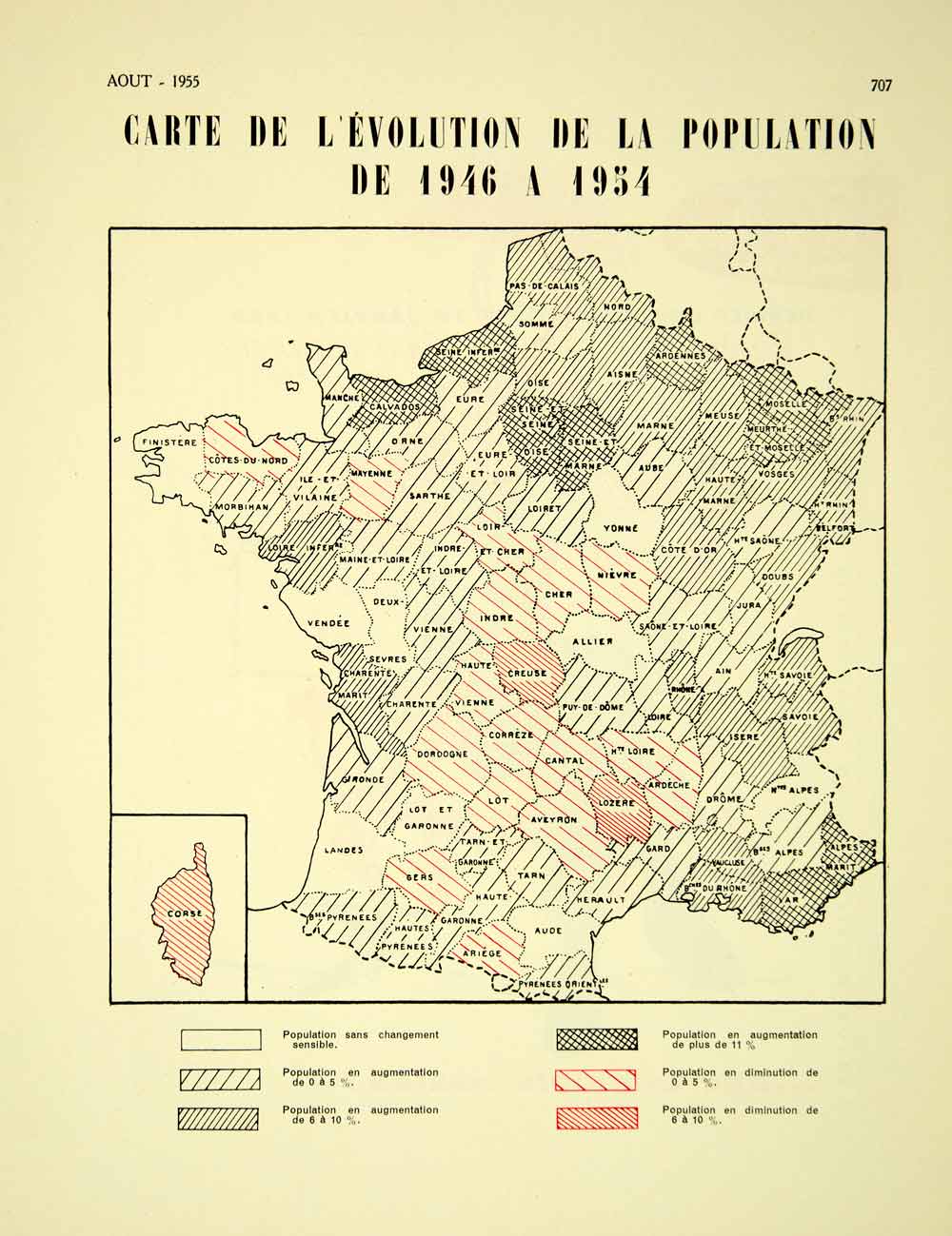 This is an original 1955 two-color lithographed map showing the change in population in the departments of France from 1946 -1954.