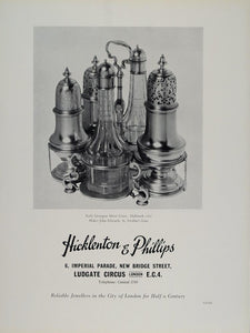This is an original 1956 black and white print ad for Hicklenton & Phillips, 6 Imperial Parade, New Bridge Street, Ludgate Circus, London. Shown here is an early Georgian Silver Cruet. Maker, John Edwards. Hallmark 1727.