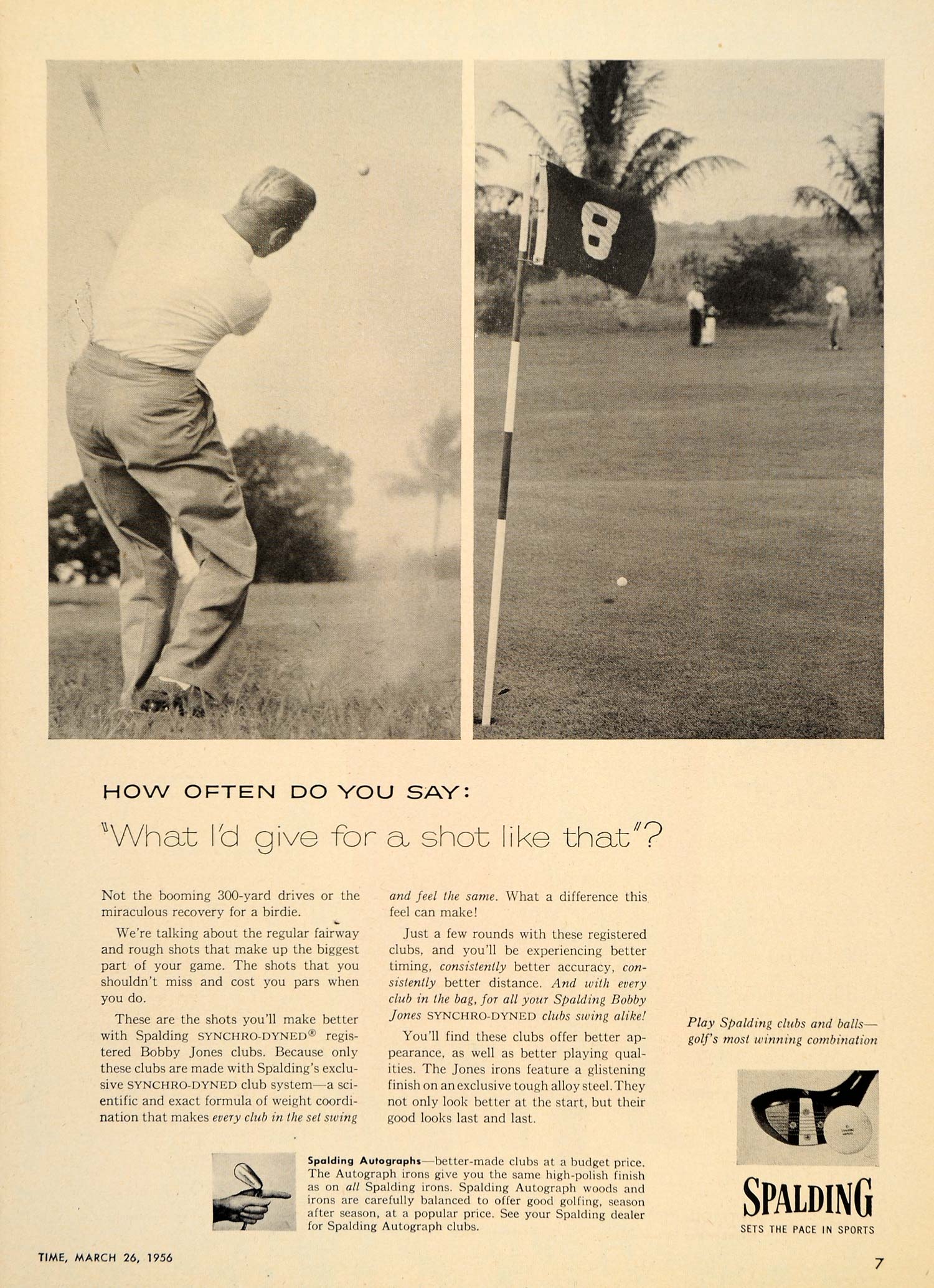 This is an original 1956 black and white print ad for Spalding Bobby Jones Synchro-Dyned Clubs located in Chicago, Illinois. With the Spalding Autograph on each iron, these clubs will always give you the best shot and never cost you pars you can't afford.