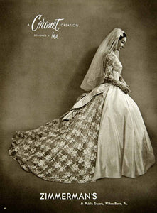 This is an original 1956 black and white print ad for the Coronet wedding dress designed by Ina that was sold at Zimmerman's of 51 Public Square, Wilkes-Barre, Pennsylvania (PA).