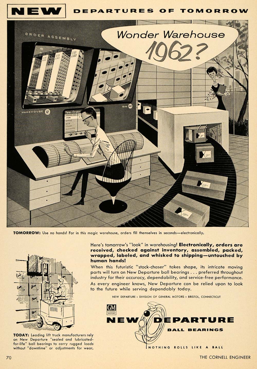 This is an original 1956 black and white print ad for New Departure Ball Bearings from General Motors. The ad features an image of a futuristic warehouse.