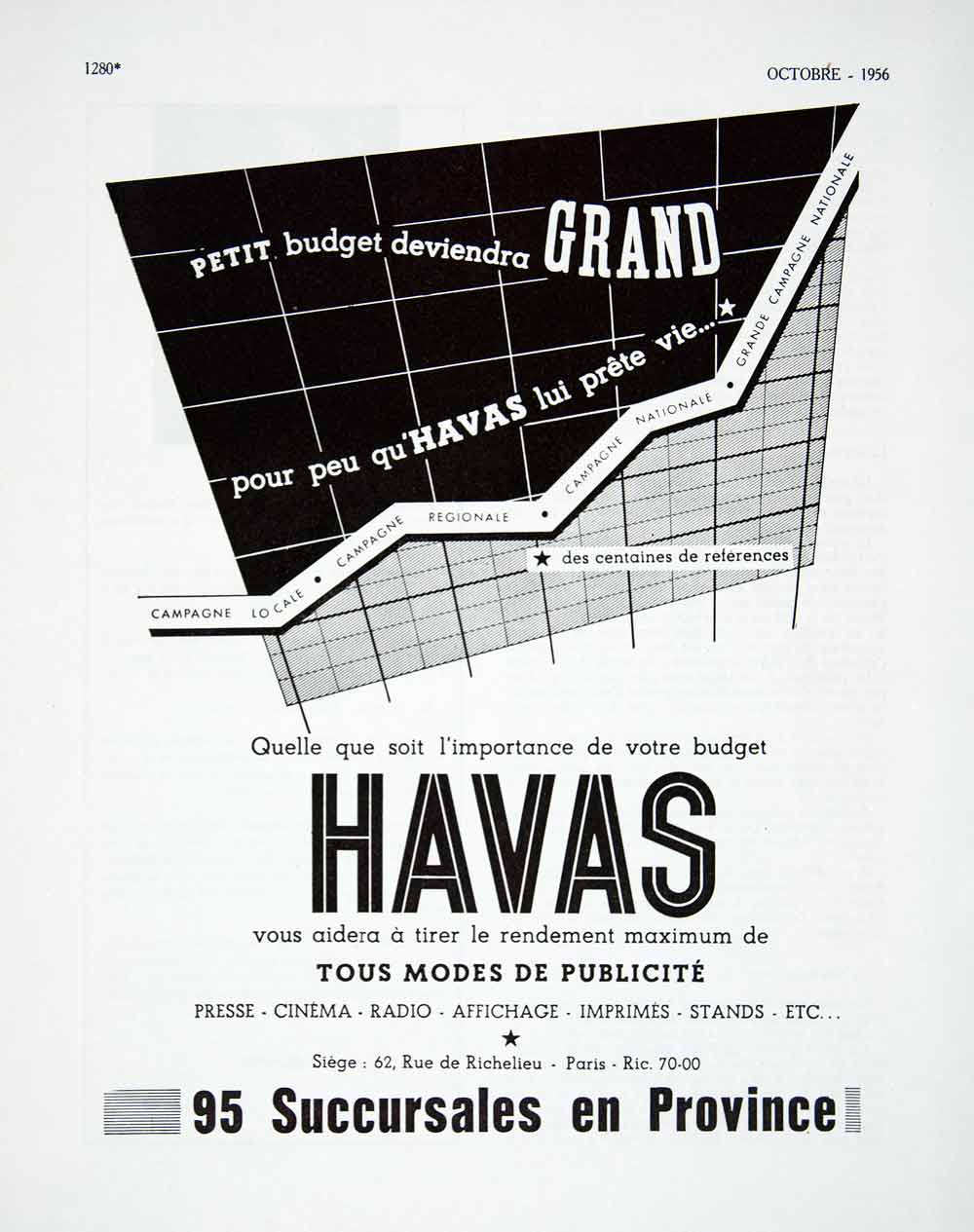 This is an original 1956 black and white print ad for Havas, a French advertising agency.