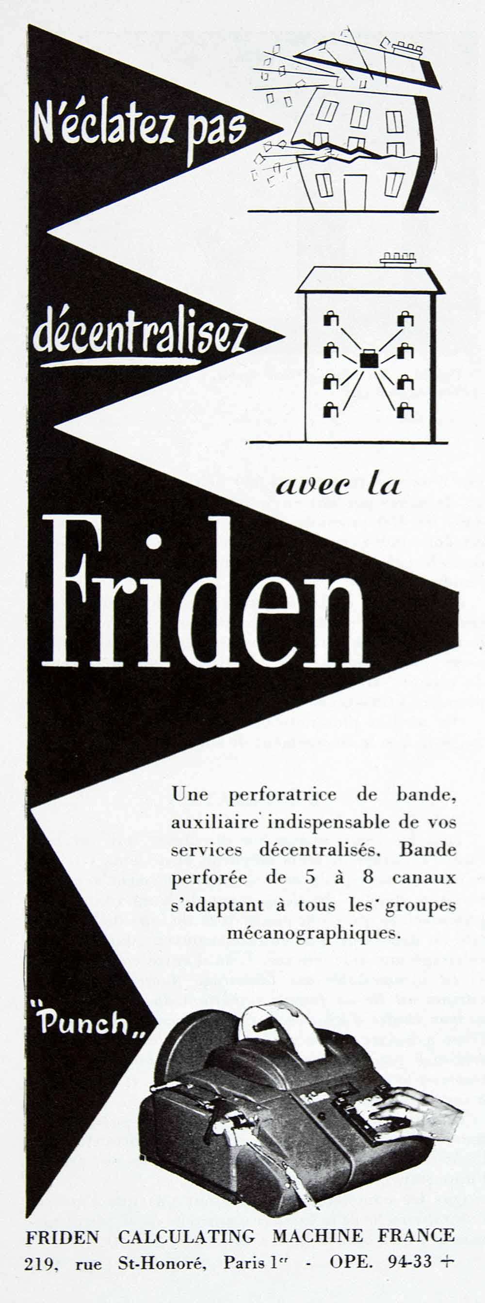 This is an original 1956 black and white print ad for Friden punch machines from Friden Calculating Machine France.