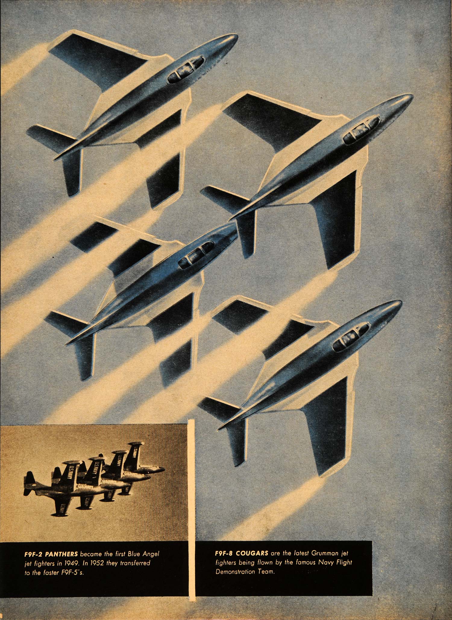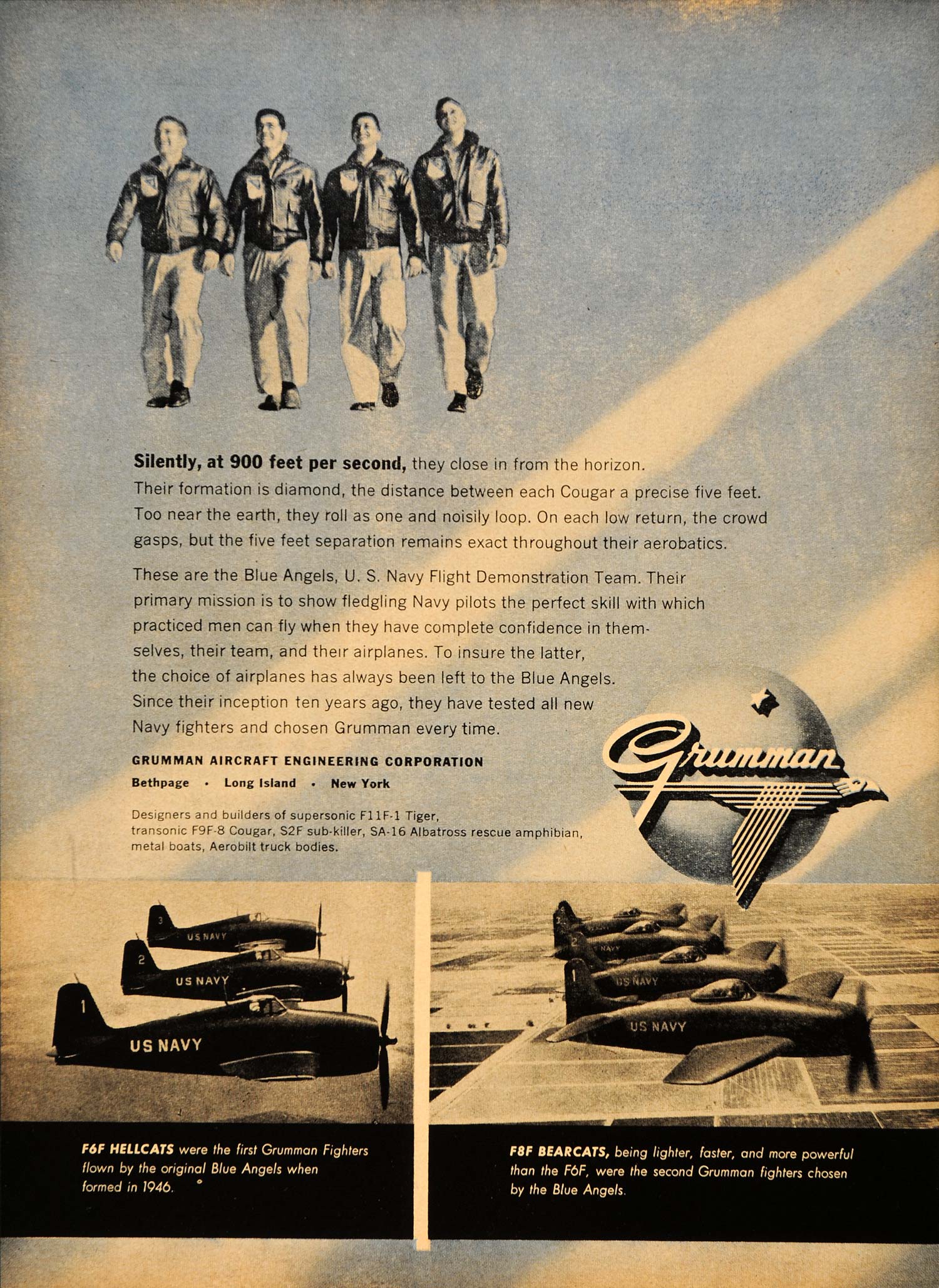 Keywords specific to this image: Blue Angels, Navy Flight Demonstration Team, aircraft, Navy pilots, military planes, Grumman Fighters, aviation Vintage Advertising