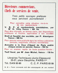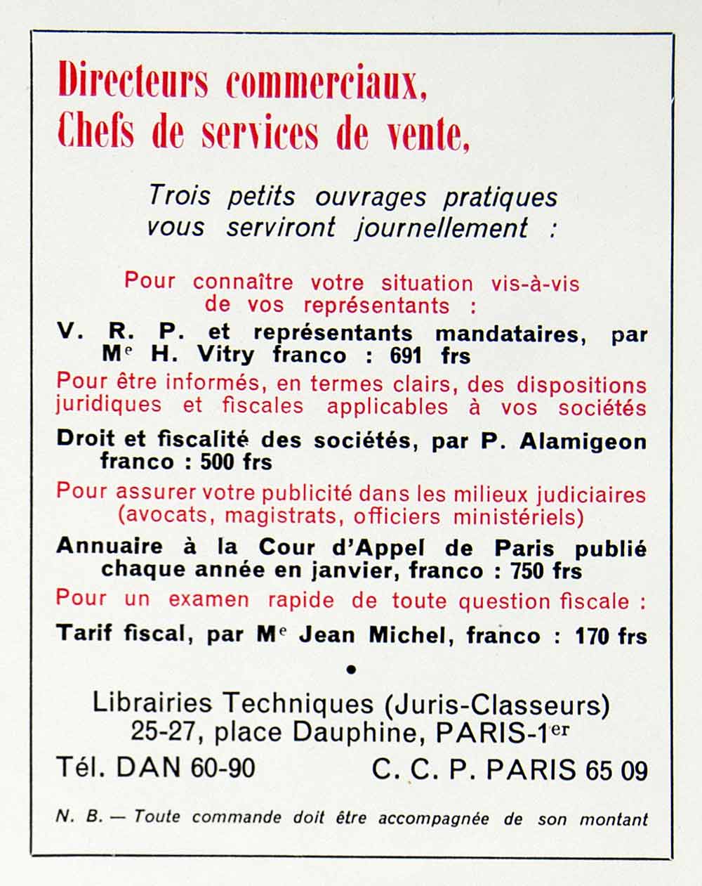 This is an original 1956 two-color print ad for the legal services of the Librairies Techniques (Juris-Classeurs), located at 25-27 place Dauphine, Paris.