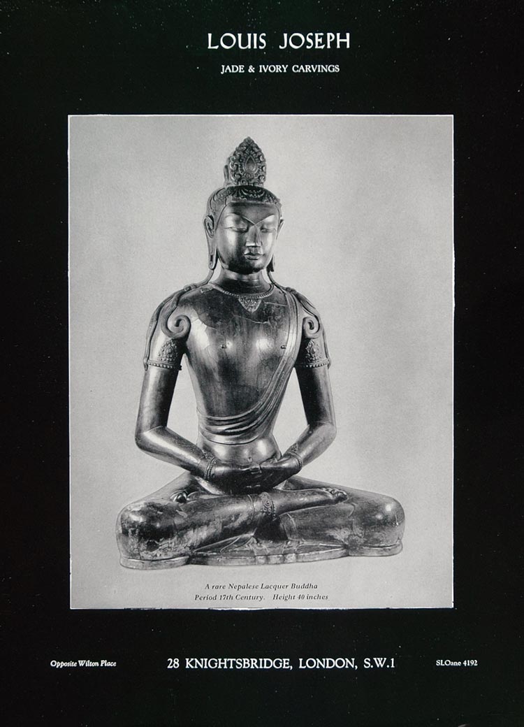 This is an original 1955 black and white print ad from Louis Joseph, 28 Knightsbridge, London. Shown here is a rare 17th Century Nepalese Lacquer Buddha.