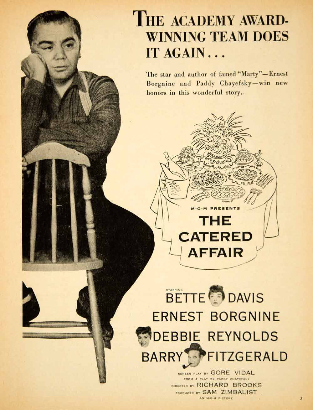 This is an original 1956 black and white print ad for the 1956 MGM movie comedy "The Catered Affair," directed by Richard Brooks and starring Bette Davis, Ernest Borgnine, Debbie Reynolds, and Barry Fitzgerald; screenplay by Gore Vidal from the play by Paddy Chayefsky. Produced by Sam Zimbalist.