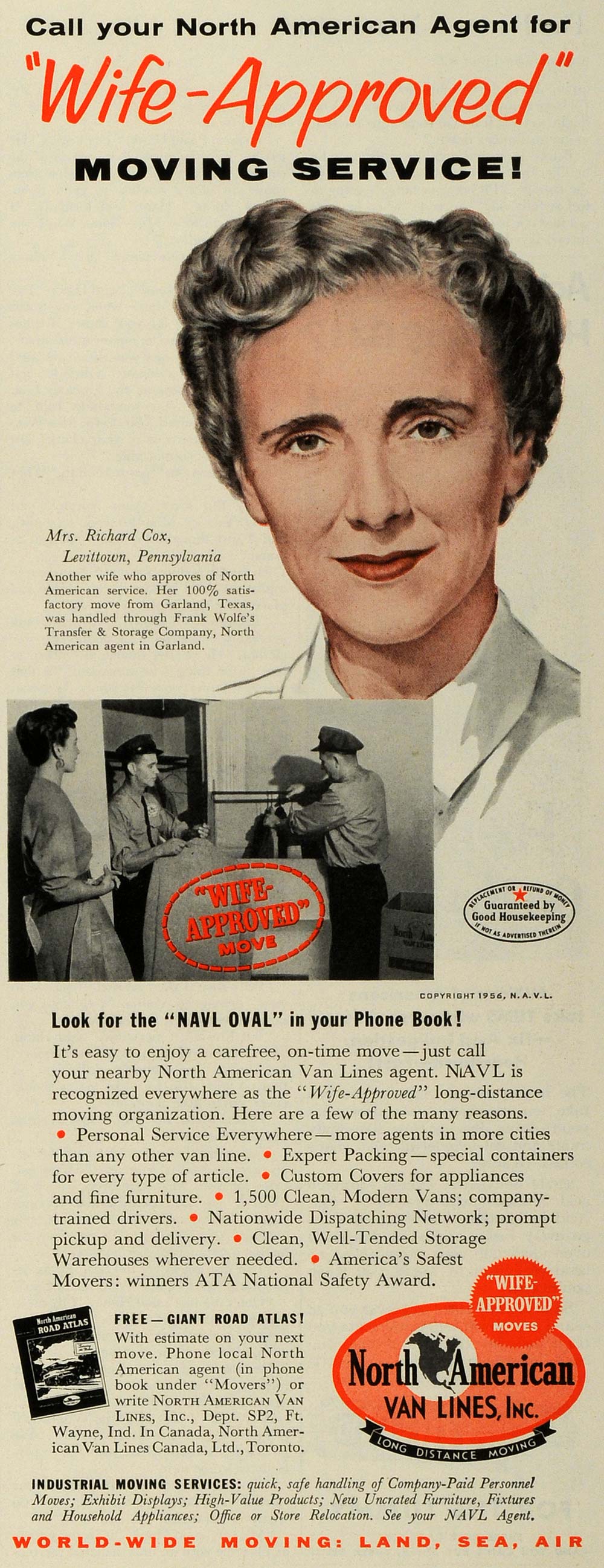 This is an original 1956 color print ad for North American Van Lines, for all your long distance moving. This particular ad features Mrs. Richard Cox of Levittown, Pennsylvania. Mrs. Cox moved from Garland, Texas through the Frank Wolfe's Transfer and Storage Company.