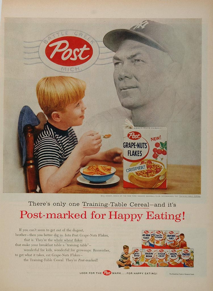 This is an original 1956 color print ad for Post Grape Nuts Flakes, the training table cereal with an endorsement from Bill Dickey, famous baseball coach and later manager of the New York Yankees.
